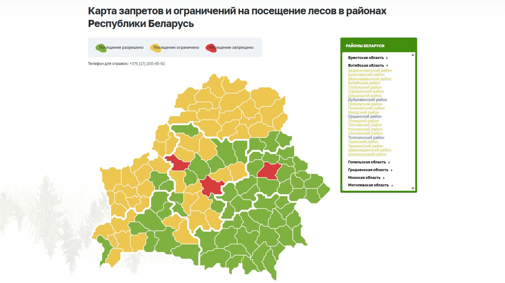 В 16 районах Беларуси действуют запреты и ограничения на посещение лесов. Об этом свидетельствует интерактивная карта Министерства лесного хозяйства, сообщает БЕЛТА.Запреты коснулись Минской области - Воложинского и Пуховичского районов, а также Могилевского района Могилевской области.Ограничения введены в Слуцком районе Минской области, Жабинковском, Кобринском, Пружанском районах Брестской области, Верхнедвинском районе Витебской области, Берестовицком, Волковысском, Гродненском, Мостовском, Ошмянском, Свислочском, Сморгонском и Щучинском районах Гродненской области.Свободной от запретов и ограничений остается Гомельская область.Интерактивная карта на портале Министерства лесного хозяйства постоянно обновляется.