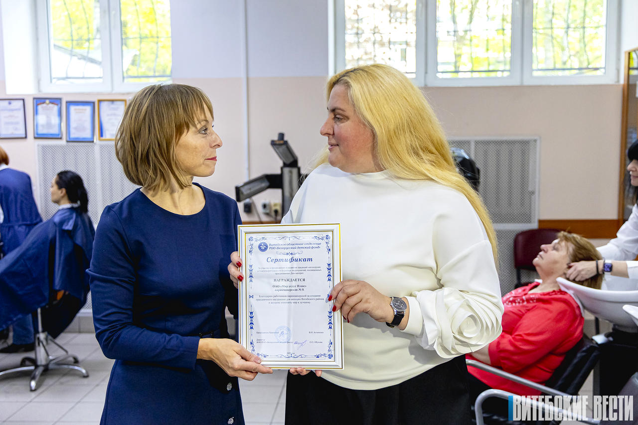 – Когда к нам обратился Белорусский детский фонд с предложением провести такую акцию, мы подумали: «Почему бы и нет?» – рассказывает заместитель начальника планового производственного отдела по сети парикмахерских ОАО «Мир услуг плюс» Светлана Латышева. – Потому что это здорово. Мы делаем приятное мамам, это наш комплимент в праздник. Мастера тоже всегда с удовольствием принимают участие в этих мероприятиях.