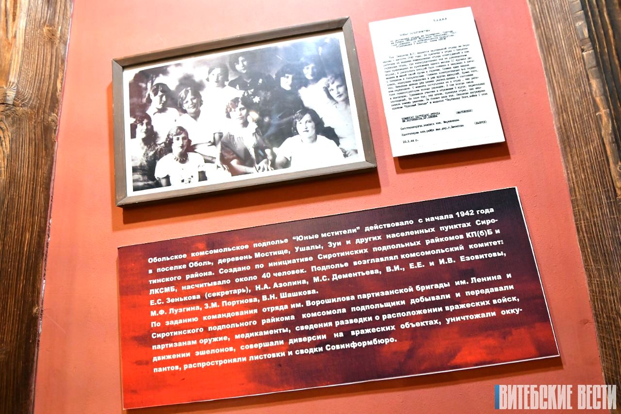 Он был открыт в день рождения комсомола 29 октября 1965 года. Большая часть экспонатов – это материалы о деятельности легендарной подпольной комсомольской организации «Юные мстители», действовавшей на территории Обольского сельсовета в годы Великой Отечественной войны, единственной в своем роде молодежной организации не только на Витебщине, но и во всей Беларуси.