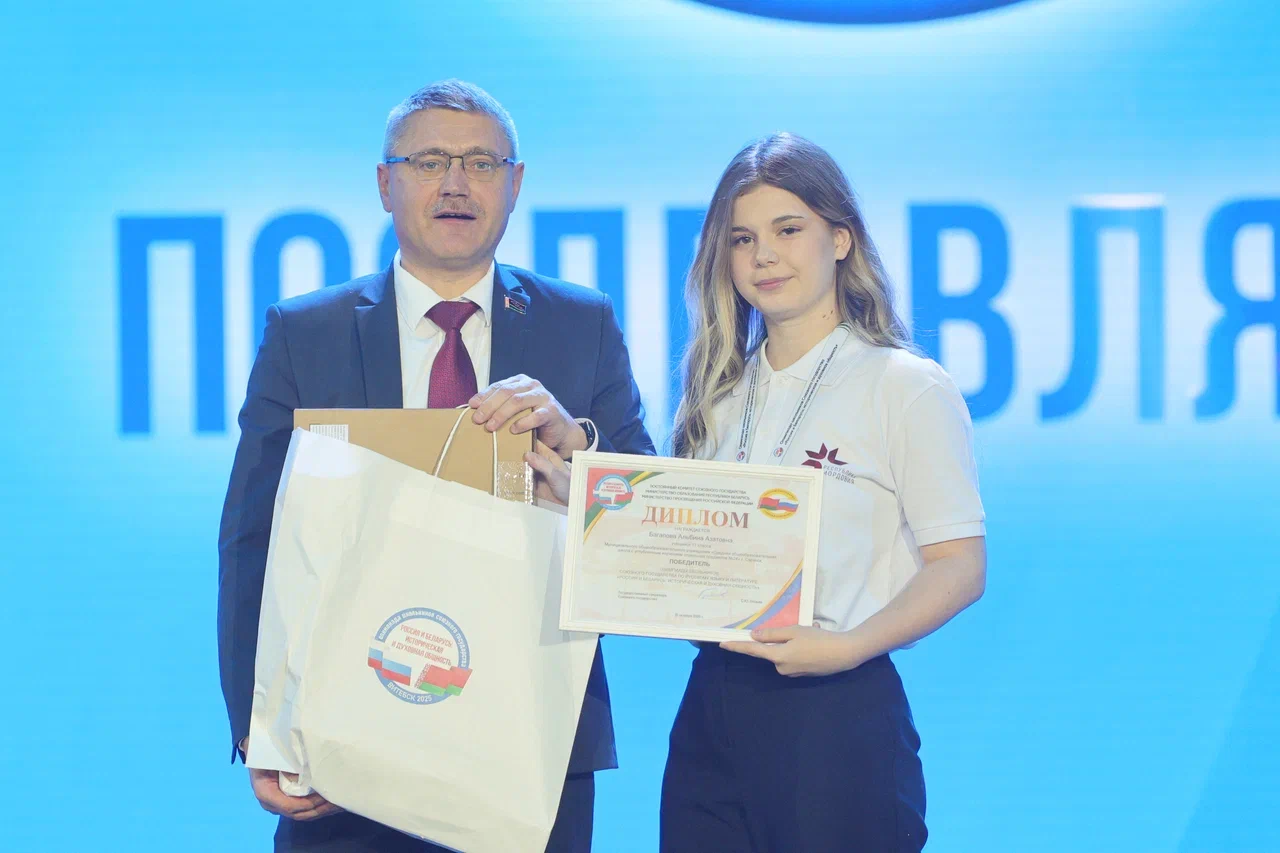 Консультант представительства Постоянного комитета Союзного государства в Минске Александр Лукашевич, вручая награду победительнице, отметил высокий уровень знаний участников, дружескую атмосферу среди ребят и важность таких мероприятий для молодежи Союзного государства.