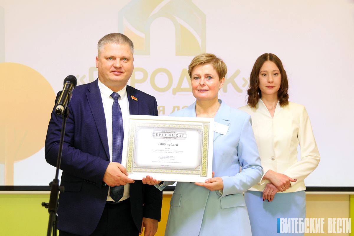 Глава депутатского корпуса области вручил заведующему детским садом № 115 г. Витебска «Городок» Татьяне Савельевой подарочный сертификат на сумму 10 тыс. рублей.