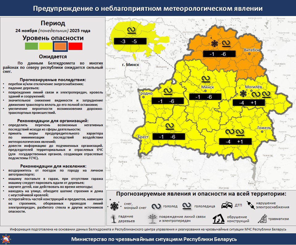 В ночь на 24 ноября в северных районах Беларуси ожидается сильный снег, сообщает "Витебскоблгидромет". Температура в Витебской области прогнозируется - 6…- 1°C. Объявлен оранжевый уровень опасности.