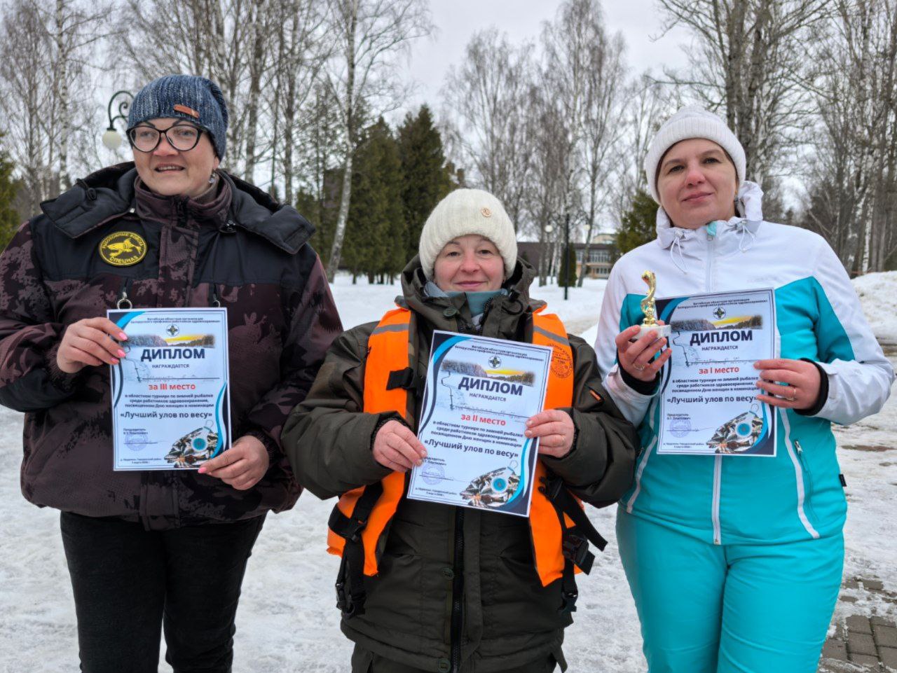 В номинации «Лучший улов» среди женщин 1-е место у Ольги Быковой (Детский реабилитационно-оздоровительный центр «Жемчужина»); 2-е место у Ирины Фетченко (Шумилинская ЦРБ); 3-е место у Елены Шлыковой (Витебский областной клинический центр дерматовенерологии и косметологии).