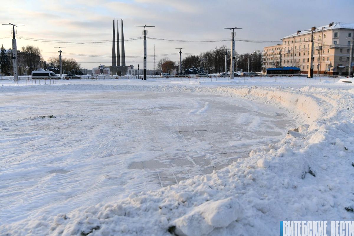 В Витебске на площади Победы начались подготовительные работы к заливке катка. Уже расчищена площадка под каток.