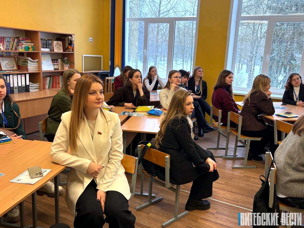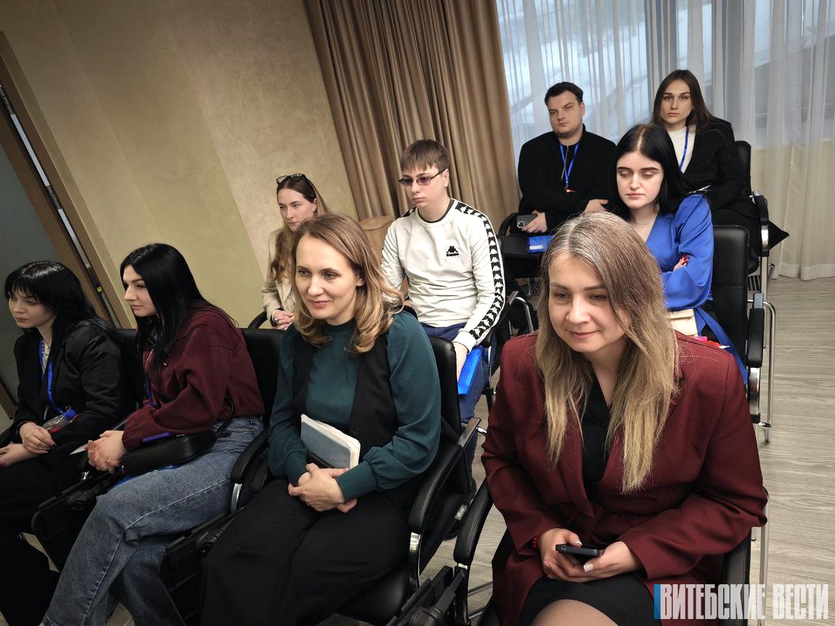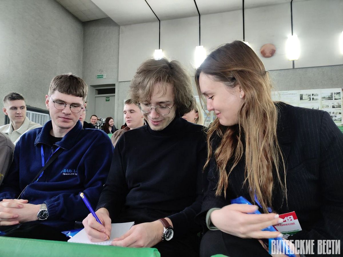 В актовом зале вместе со вторым секретарём Октябрьского районного комитета ОО БРСМ г.Витебска Ксенией Вишневской ребята начали дискуссию на тему своей профессиональной специализации. Обсуждают и свои предпочтения и хобби.