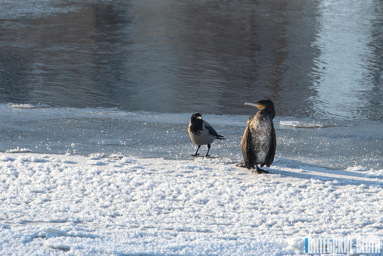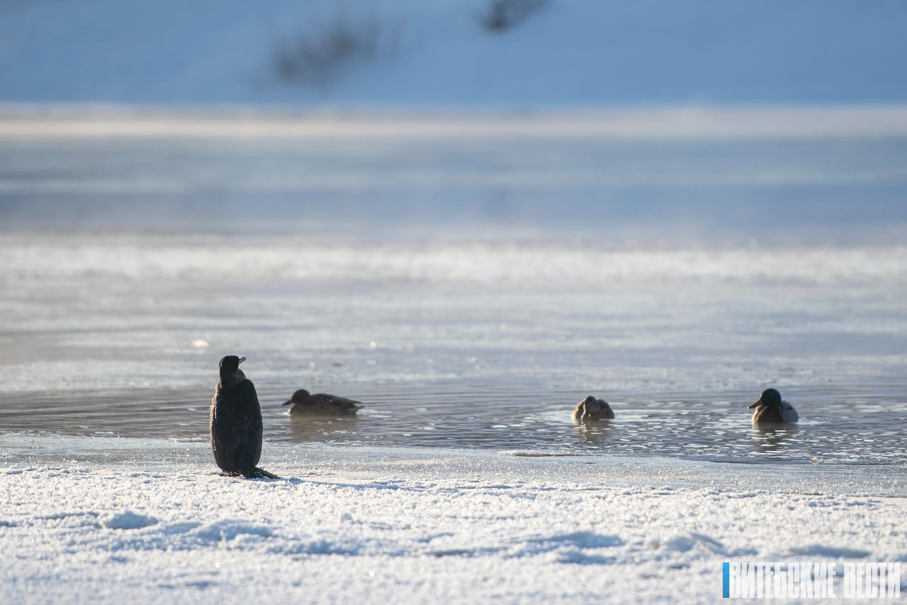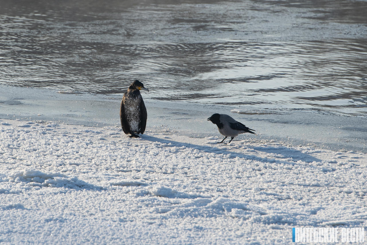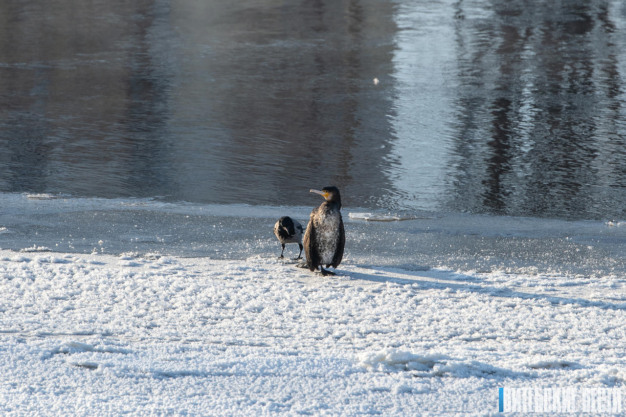 Но в какой-то момент, обратив внимание на резкие вороньи крики, я увидел стоявшую на заснеженном берегу реки большую, сильно выделяющуюся своими размерами птицу, силуэт которой чем-то напоминал пингвина. Это был большой баклан.
