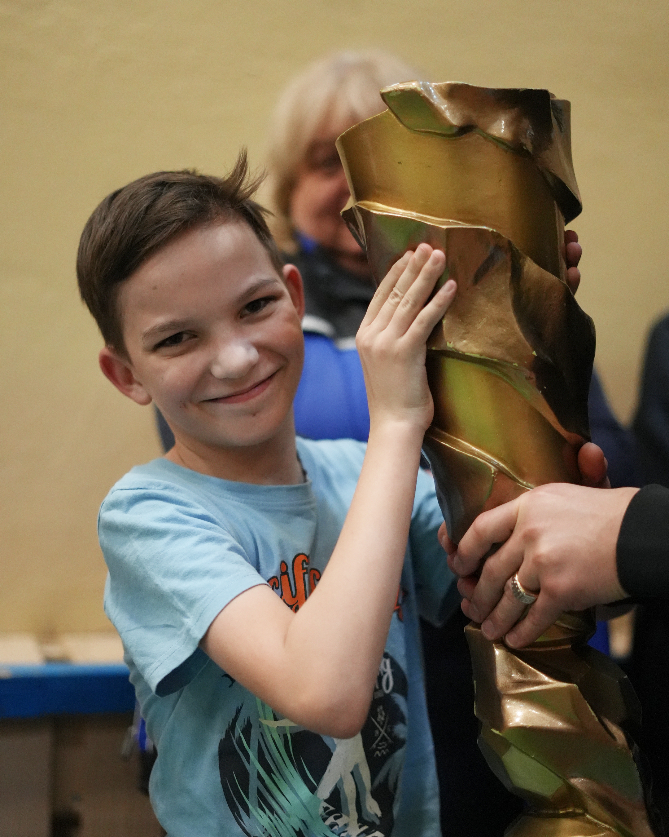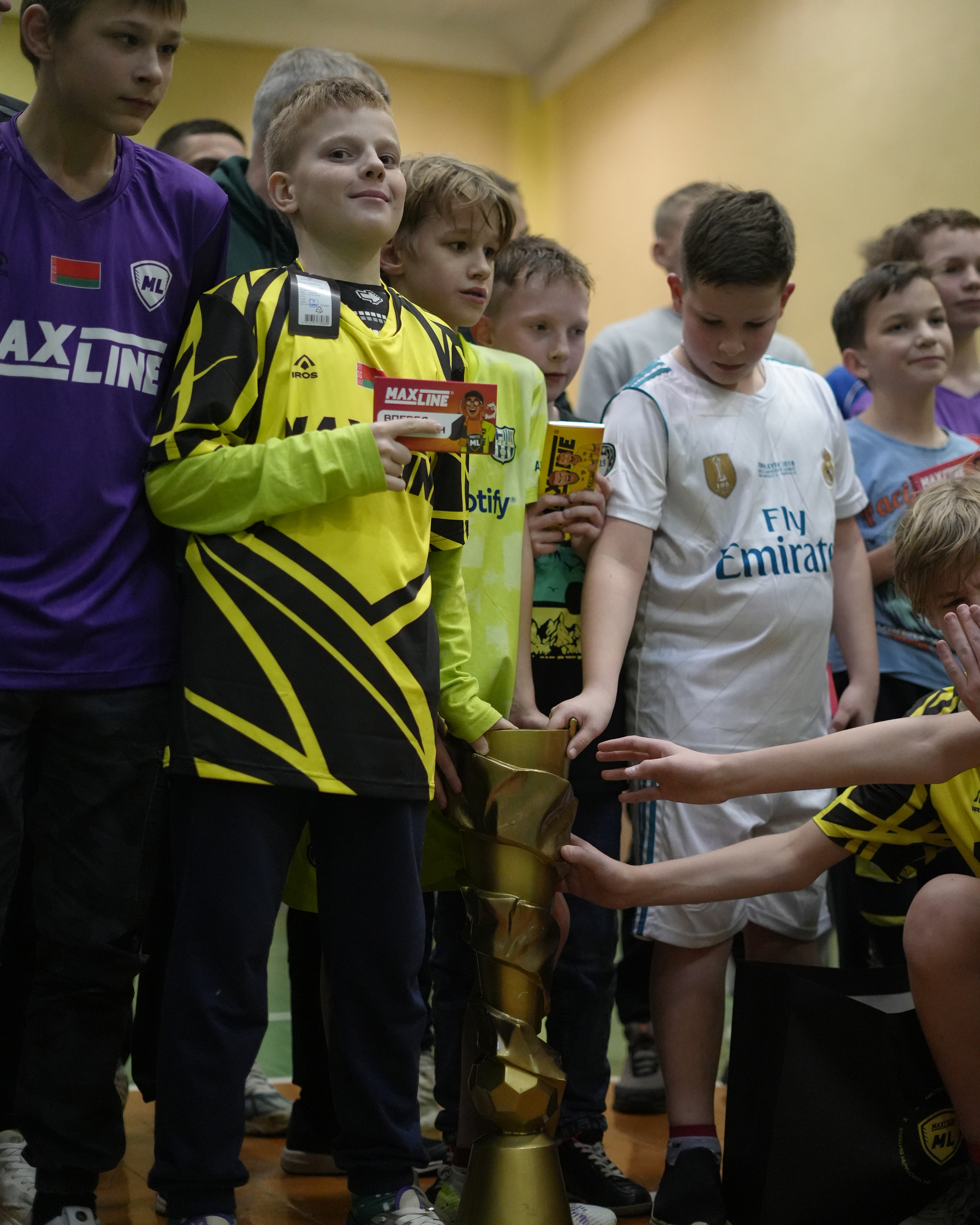 Дети встретили гостей в спортзале вместе с педагогами и родителями. Каждый из них прикоснулся к чемпионскому Кубку. Гости подарили учащимся школы-интерната футбольную форму и сладости.