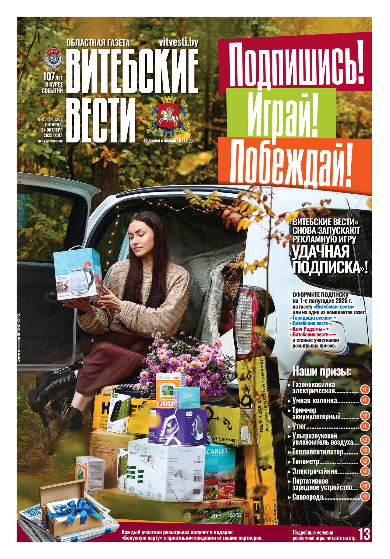 Основанием для участия в Рекламной игре является купон участника – подписчика на газету «Витебские вести» или на один из комплектов газет «Гарадоцкі веснік» + «Витебские вести», «Кліч Радзімы» + «Витебские вести» (публикуется в газетах «Витебские вести», «Гарадоцкі веснік», «Кліч Радзімы» с 24 октября по 31 декабря 2025 г.).