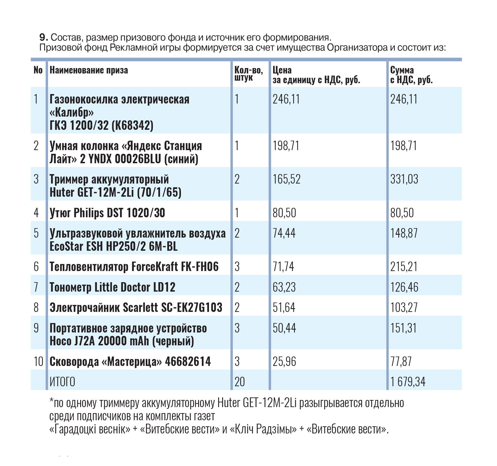 Общая стоимость призового фонда Рекламной игры составляет 1 679,34 (одна тысяча шестьсот семьдесят девять белорусских рублей 34 копейки с НДС).