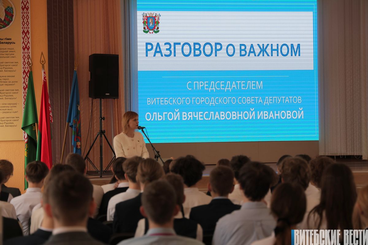 О структуре государственных органов, ВНС, электоральных кампаниях, работе депутатского корпуса всех уровней, а также вопросах благоустройства Витебска председатель городского Совета депутатов Ольга Иванова поговорила с учащимися гимназии № 2 областного центра в рамках проекта «Разговор о важном».
