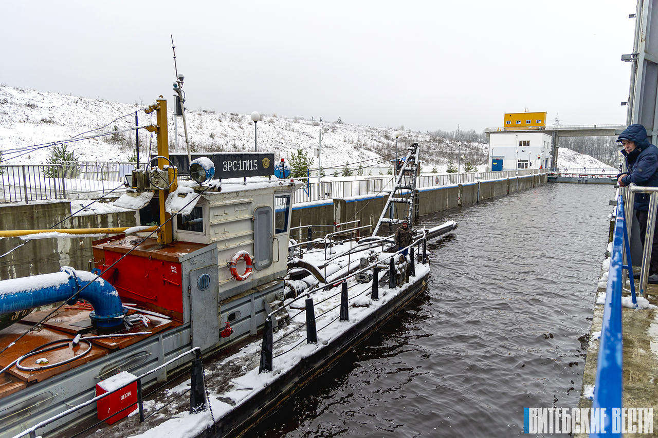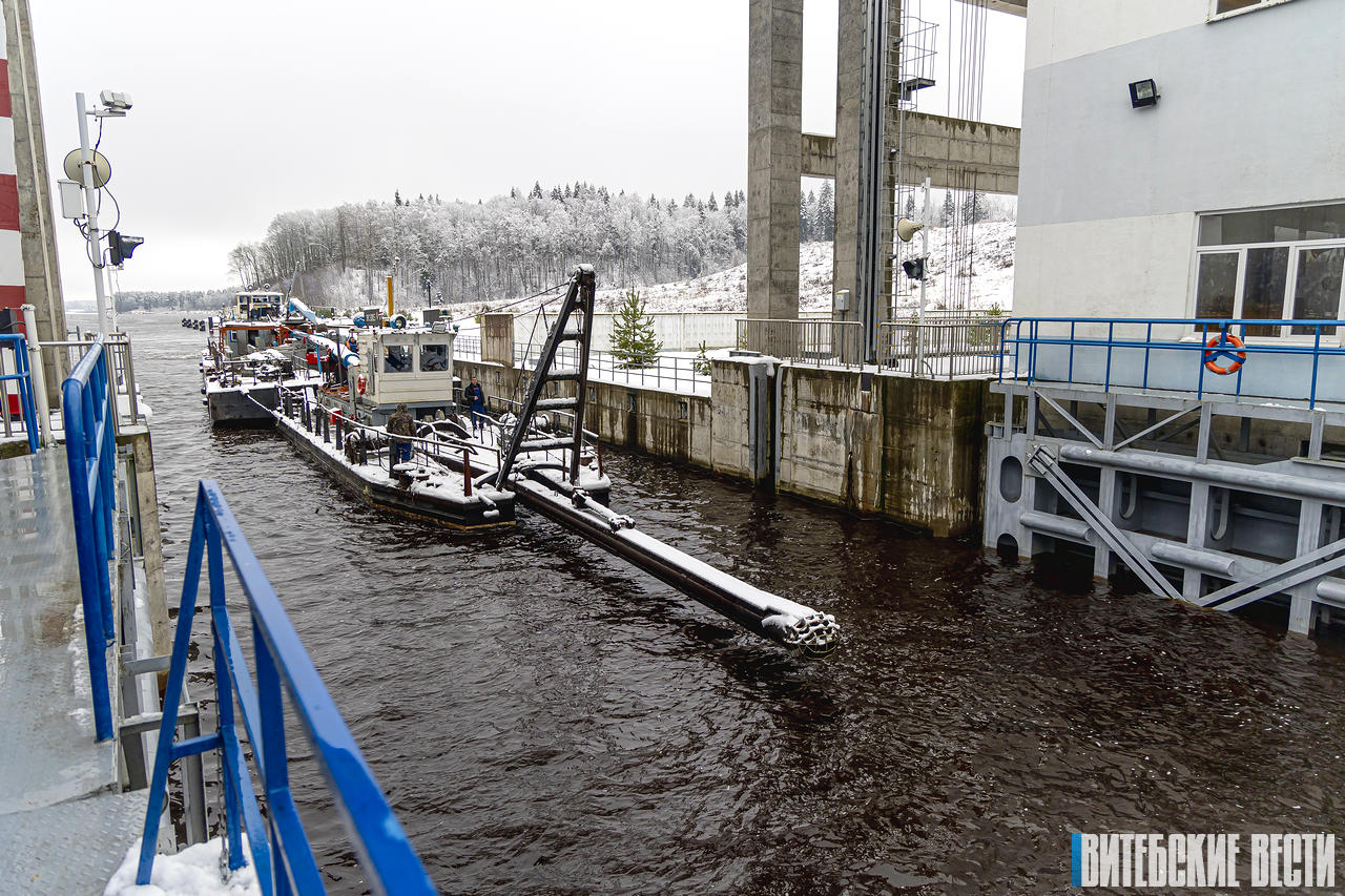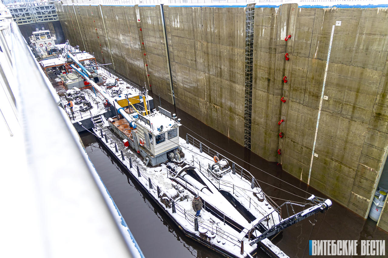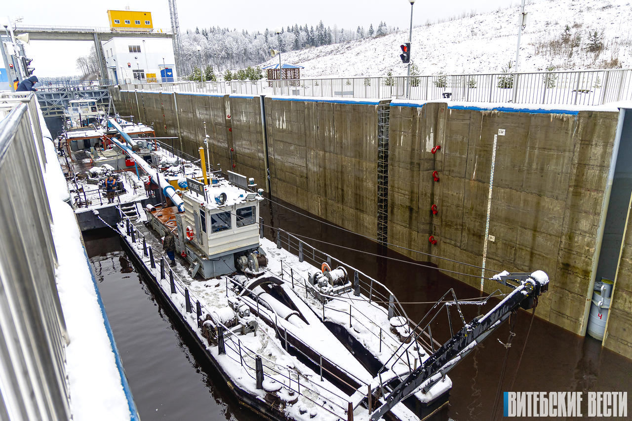 Сегодня из района деревни Островские Витебского района по Западной Двине в речной порт доставлен земснаряд, на котором посменно трудятся представители семьи Наумовых – о них наша газета писала в сентябре. Корреспонденты «ВВ» наблюдали, как 90-метровая сцепка земснаряда и теплохода проходит шлюз Витебской ГЭС. Процедура заняла около сорока минут – большая часть времени ушла на наполнение и спуск воды из «емкости» глубиной 13 м. К слову, с начала навигации прошло 106 шлюзований. Кроме судов «Витебскводтранса», плотину ГЭС таким образом преодолевали пассажирские теплоходы «Витебск» и «Северная столица».