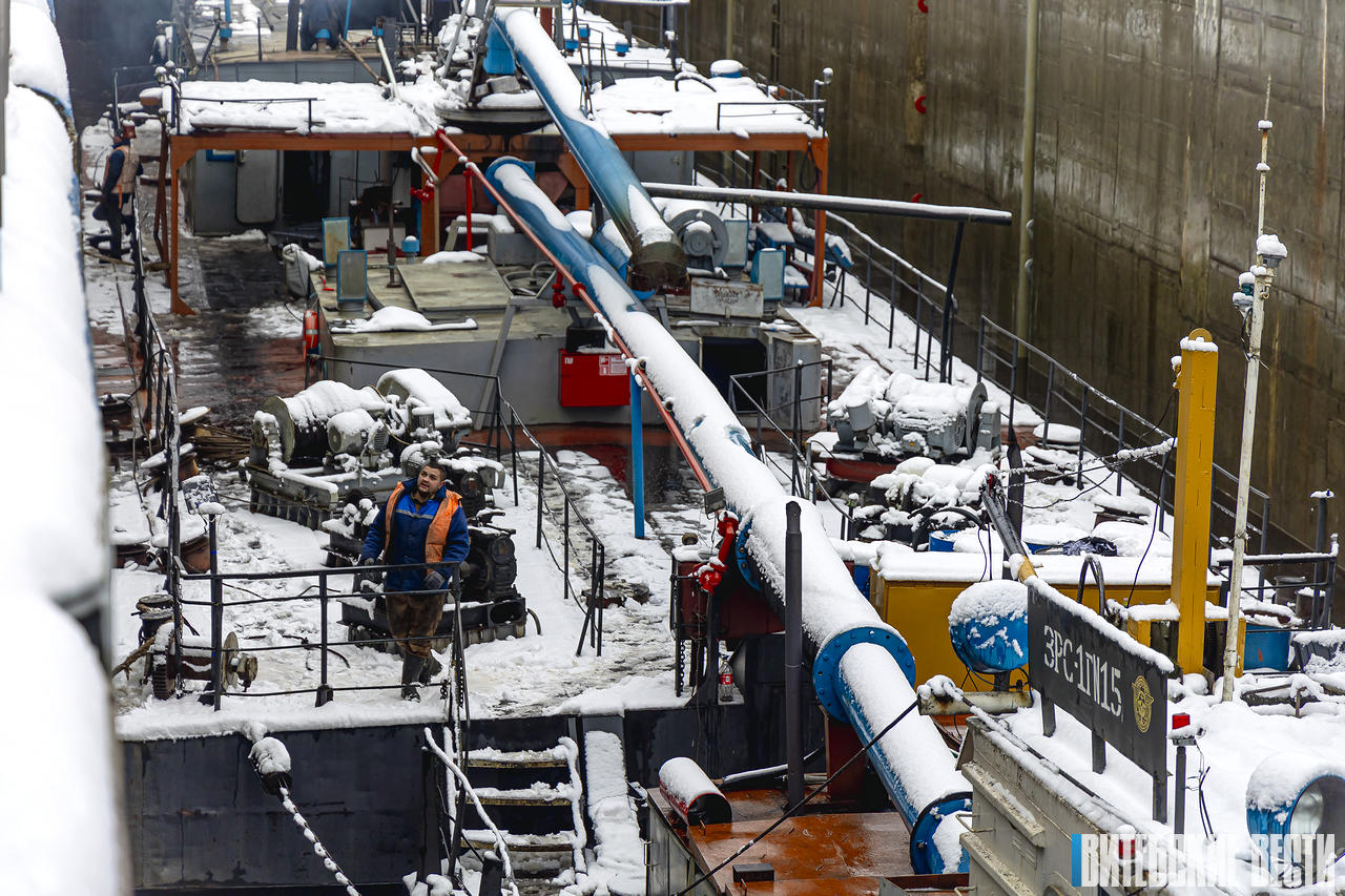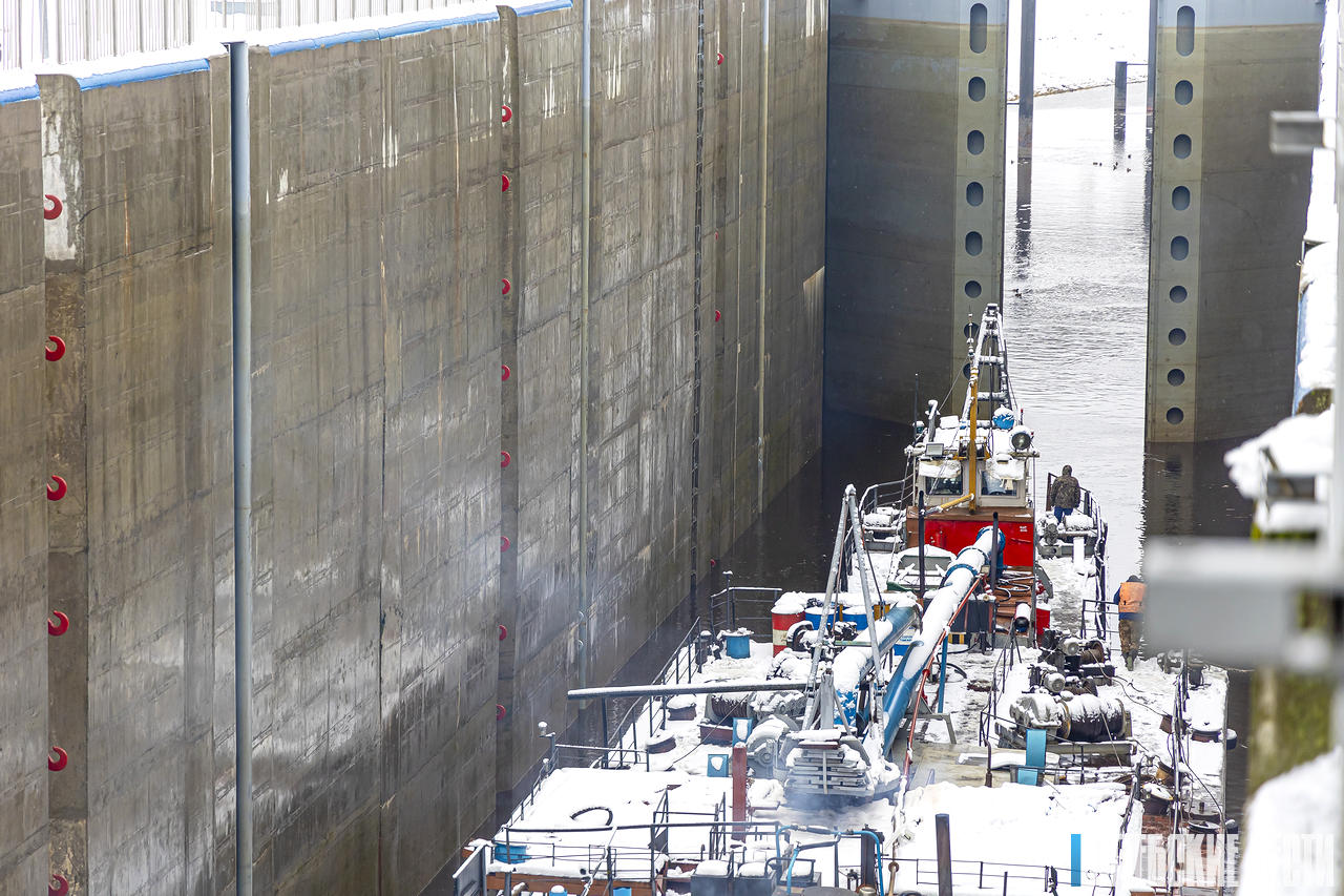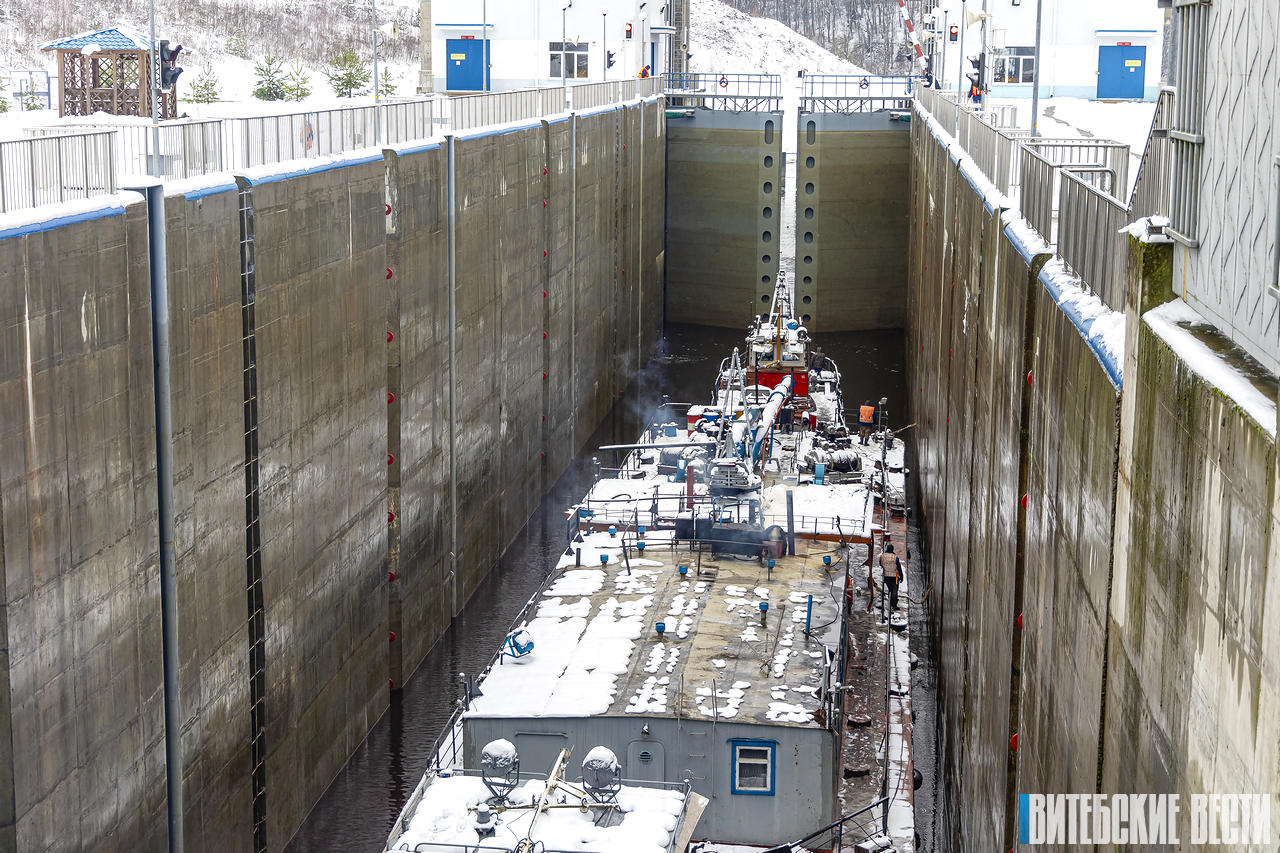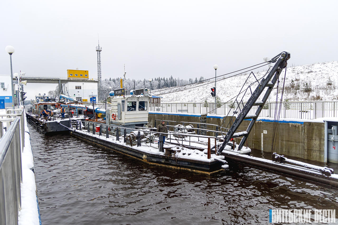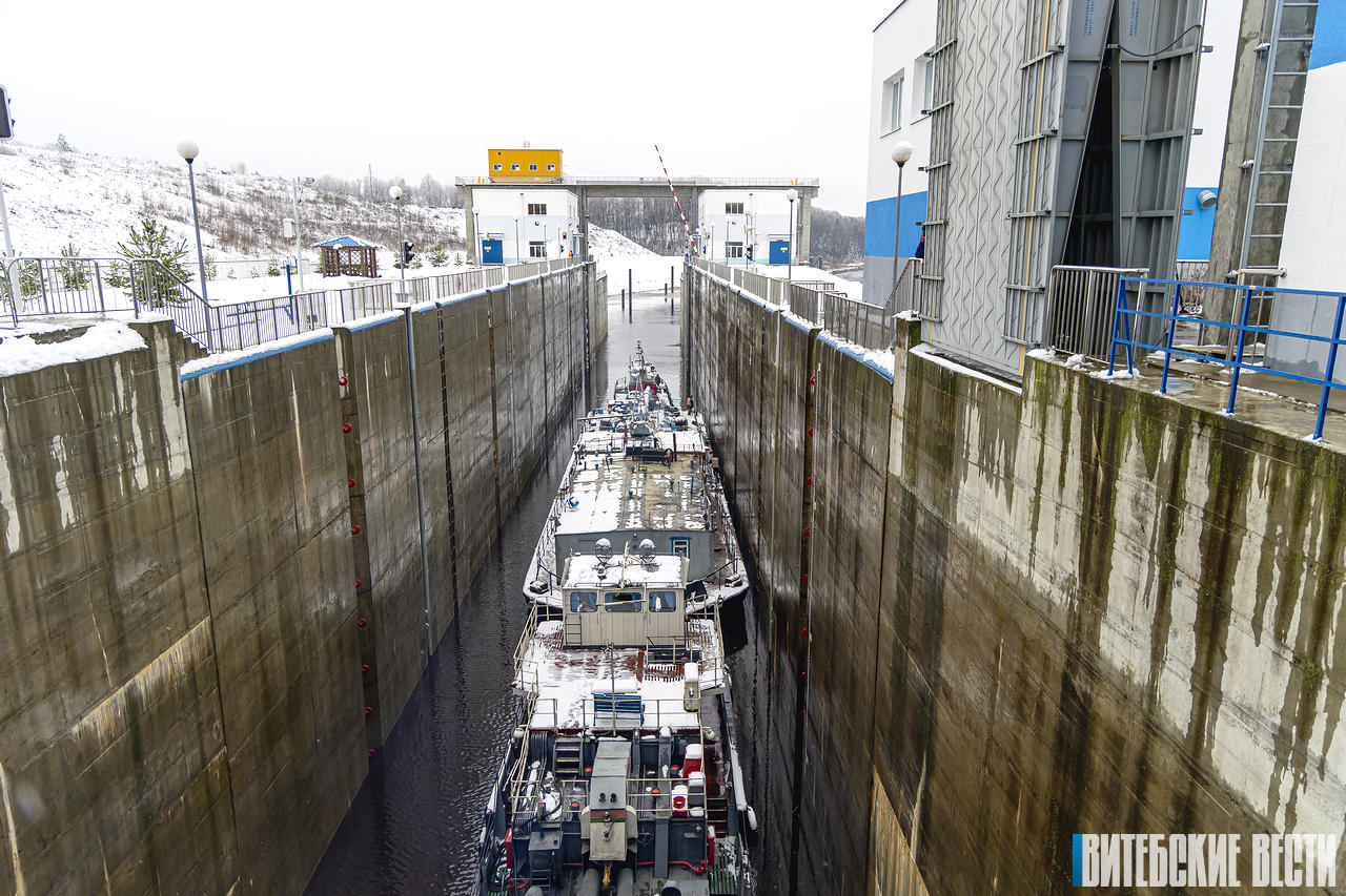 Сегодня из района деревни Островские Витебского района по Западной Двине в речной порт доставлен земснаряд, на котором посменно трудятся представители семьи Наумовых – о них наша газета писала в сентябре. Корреспонденты «ВВ» наблюдали, как 90-метровая сцепка земснаряда и теплохода проходит шлюз Витебской ГЭС. Процедура заняла около сорока минут – большая часть времени ушла на наполнение и спуск воды из «емкости» глубиной 13 м. К слову, с начала навигации прошло 106 шлюзований. Кроме судов «Витебскводтранса», плотину ГЭС таким образом преодолевали пассажирские теплоходы «Витебск» и «Северная столица».