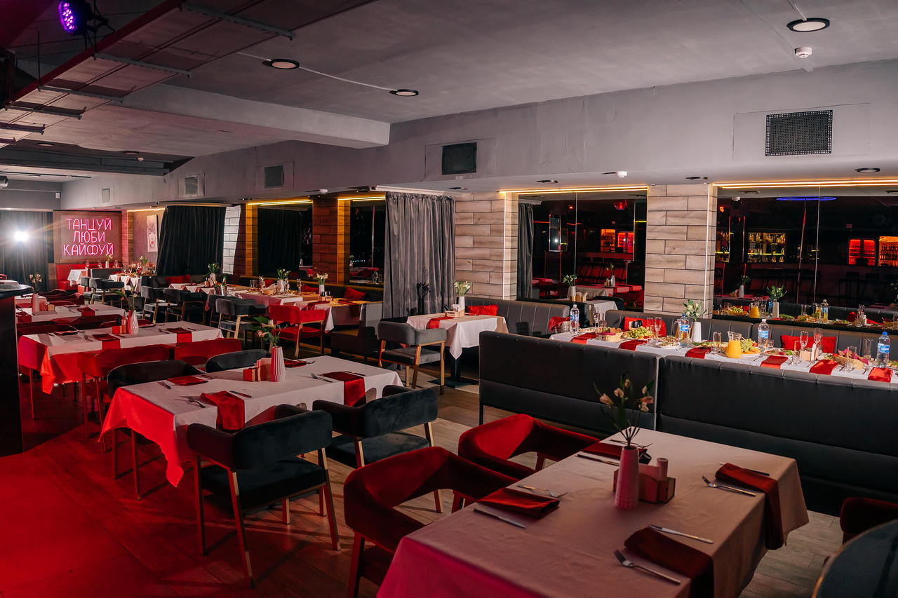 Каждую пятницу и субботу с 19.00 мы проводим развлекательную программу с профессиональными ведущими, живым вокалом, инструментальной музыкой, интерактивами, шоу-номерами и тематическими фотозонами. Программа вечера делится на банкетную часть – до 24.00 – и танцевальную с 0.00 до 5.00. Во время банкетной программы работает фотограф. Для тех, кто предпочитает уют и приватность, предусмотрен караоке-зал вместимостью 30 – 40 человек – идеальное место для незабываемого вечера в кругу друзей или коллег. Дополнительный комфорт создают стильная лаунж-зона вместимостью 50 – 60 человек и VIP-зона, где можно насладиться беседой в более камерной атмосфере.
