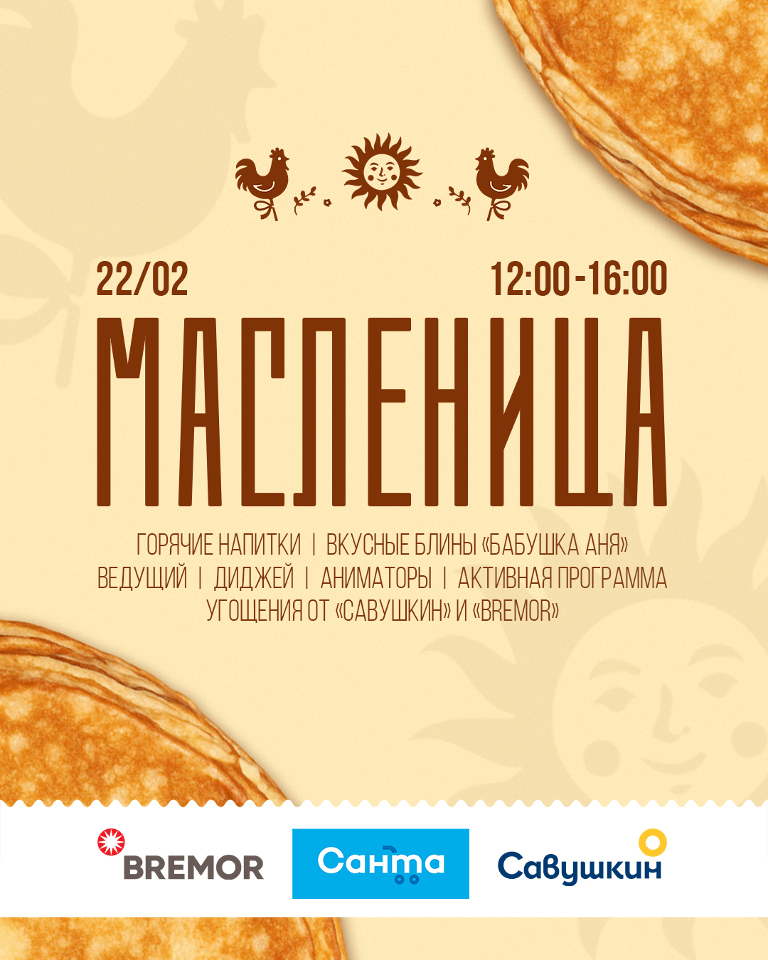 С 12:00 до 16:00 всех гостей будут бесплатно угощать ароматными блинами с начинками на любой вкус от компании BREMOR, сладостями от «Савушкина» и горячим ягодным морсом. Желающие смогут приять участие и в чайной дегустацией от Tess.