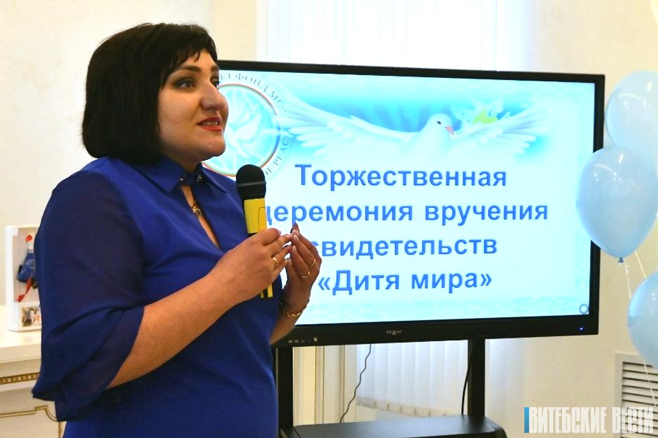 – В этом году в Витебской области в Международный день мира родилось только шестеро ребятишек: трое – в Витебске, двое – в Новополоцке и один в Шумилино, – отметила председатель областного отделения ОО «Белорусский фонд мира» Татьяна Туманова. – Всем им будут вручены сертификаты «Дитя мира» и подарки. Всего в области у нас уже около 400 таких деток. Мы следим за их судьбой, привлекаем к нашим мероприятиям.