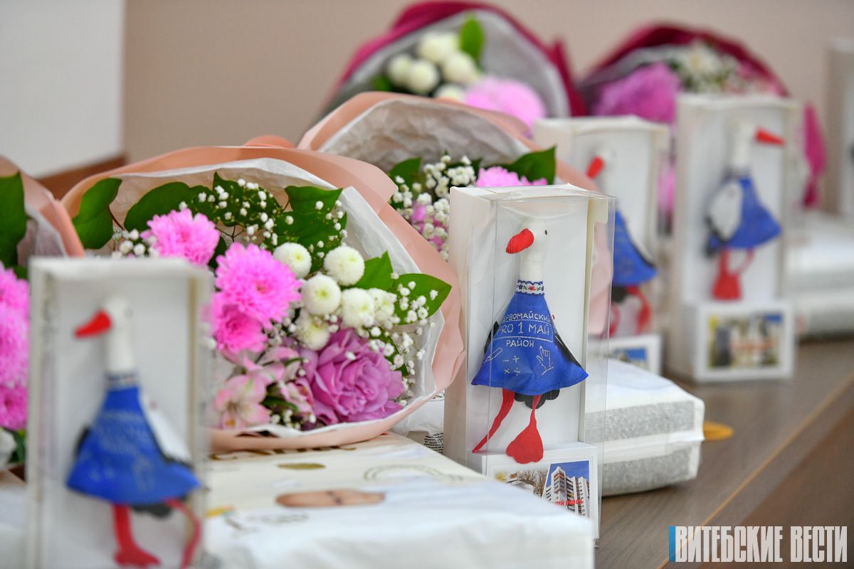 Молодым мамам вручили подарки, среди которых были книга о Витебске и символ Первомайского района Буслик.