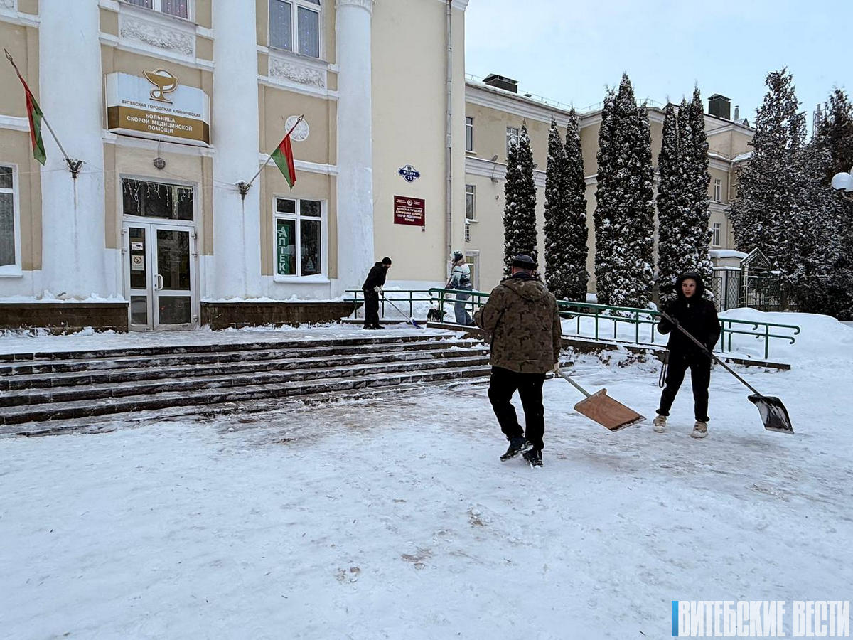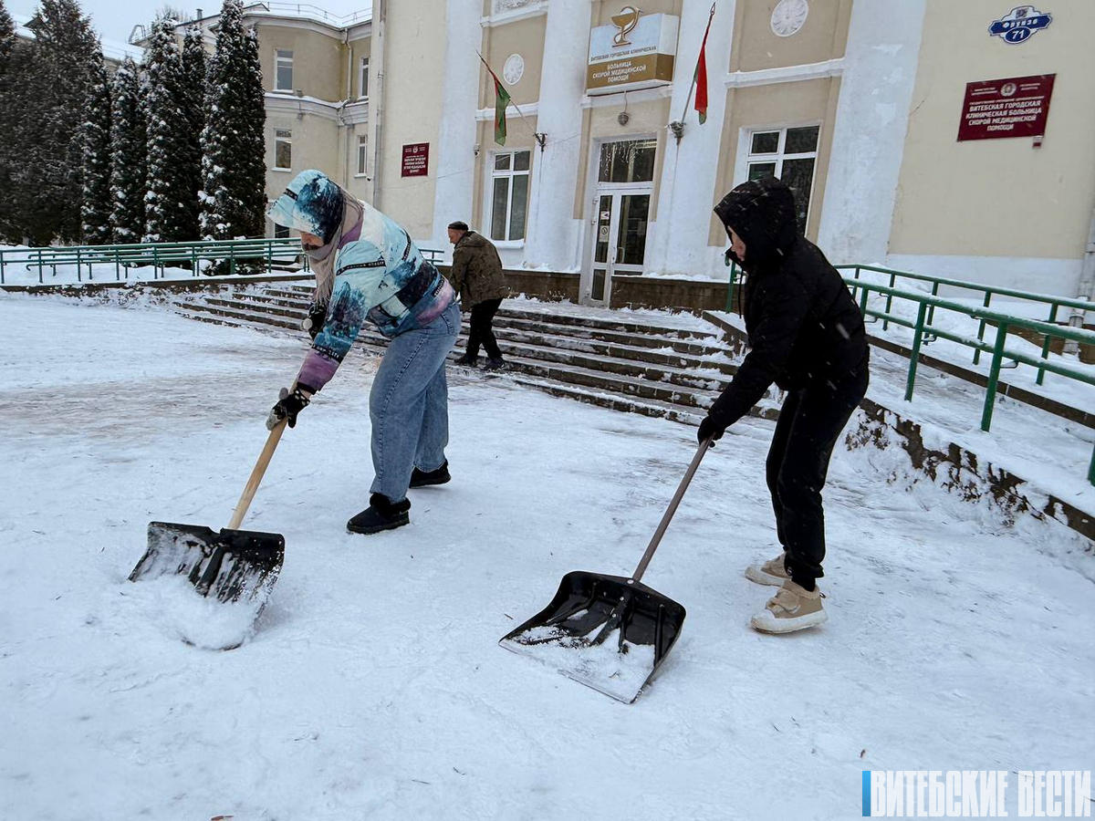 Сегодняшний день патриотов был посвящен важной миссии: они оказали помощь коммунальным службам в очистке пешеходных дорожек Витебской городской клинической больницы скорой медицинской помощи.