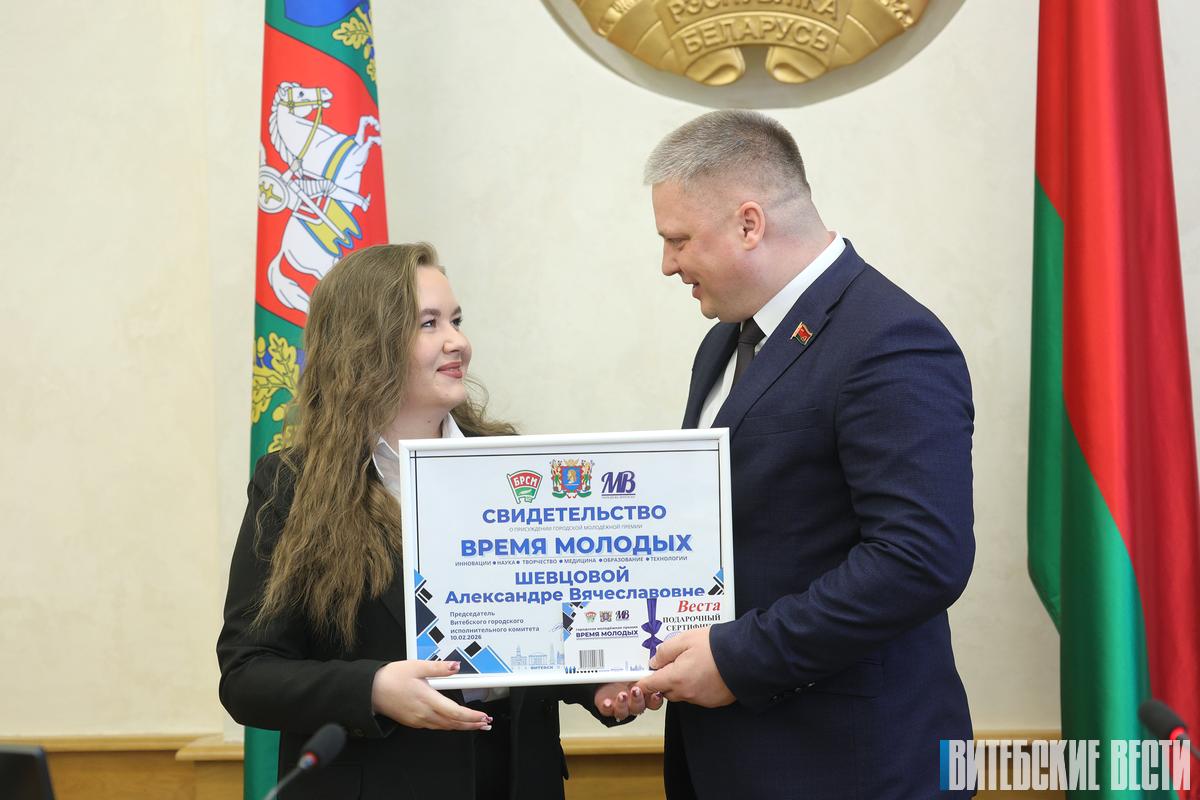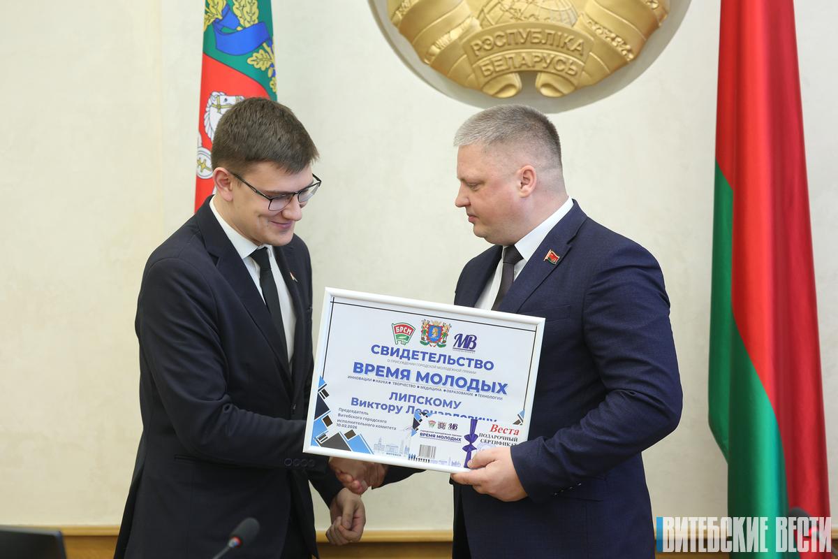 За высокие достижения в области науки и образования, медицины, спорта, культуры и искусства, гражданско-патриотического воспитания, профессиональной и общественной деятельности 10 представителям талантливой молодежи Витебска вручили городскую молодежную премию «Время молодых».