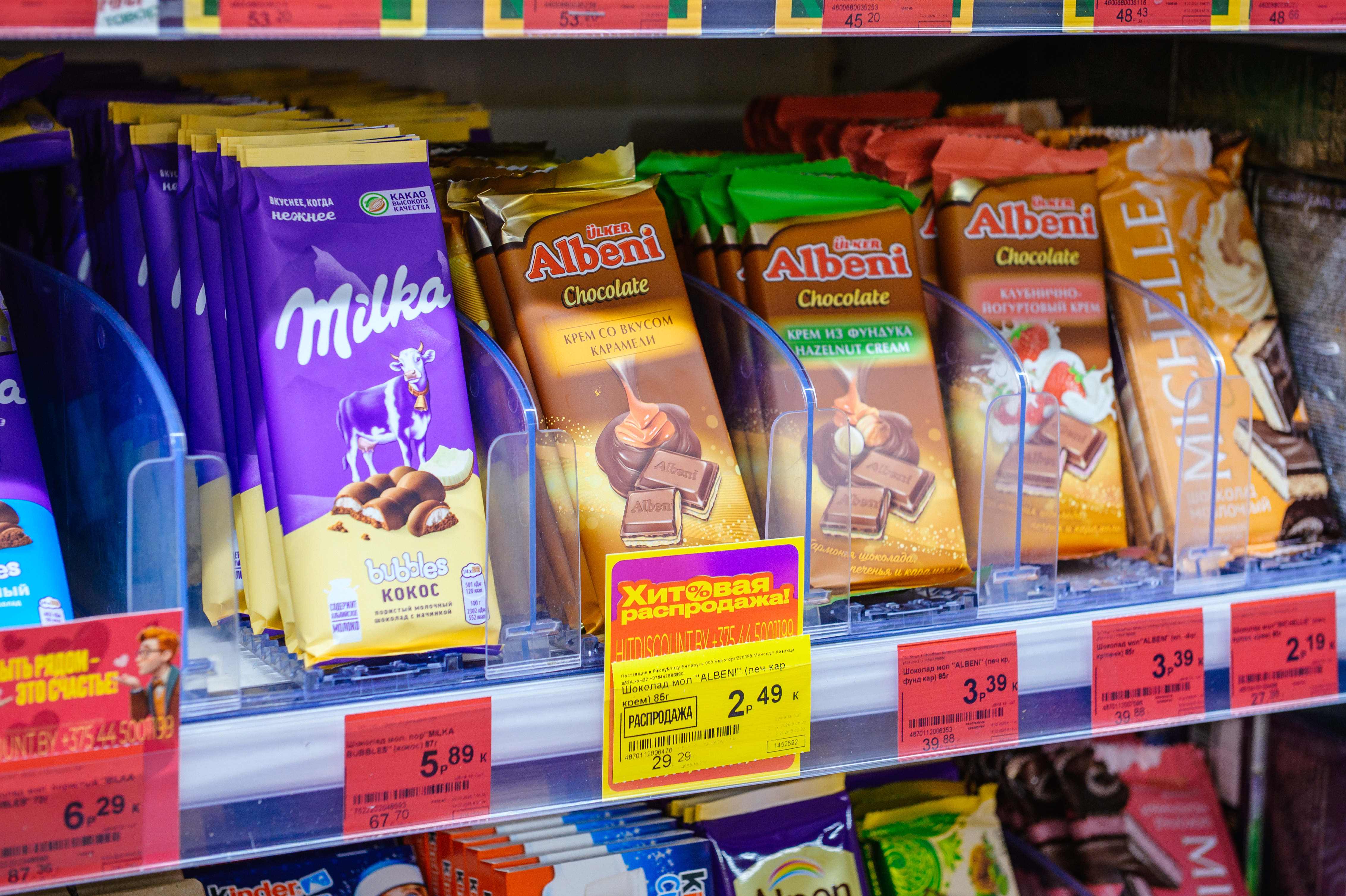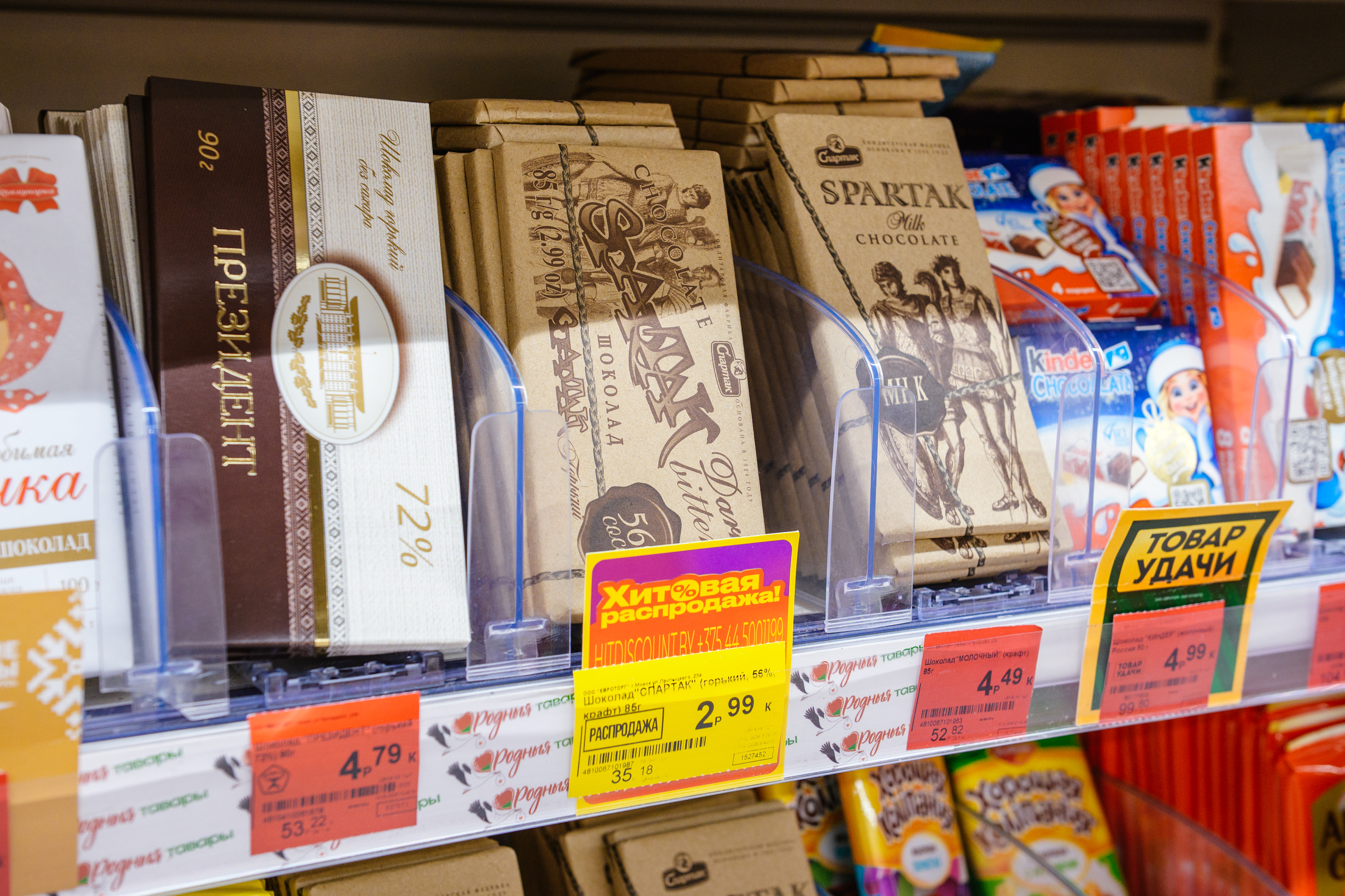Шоколад молочный Albeni, карамельный крем - 2,49 рубля за 85 грамм. Шоколад горький Spartak, кондитерская фабрика «Спартак» - 2,99 рубля за 85 грамм.