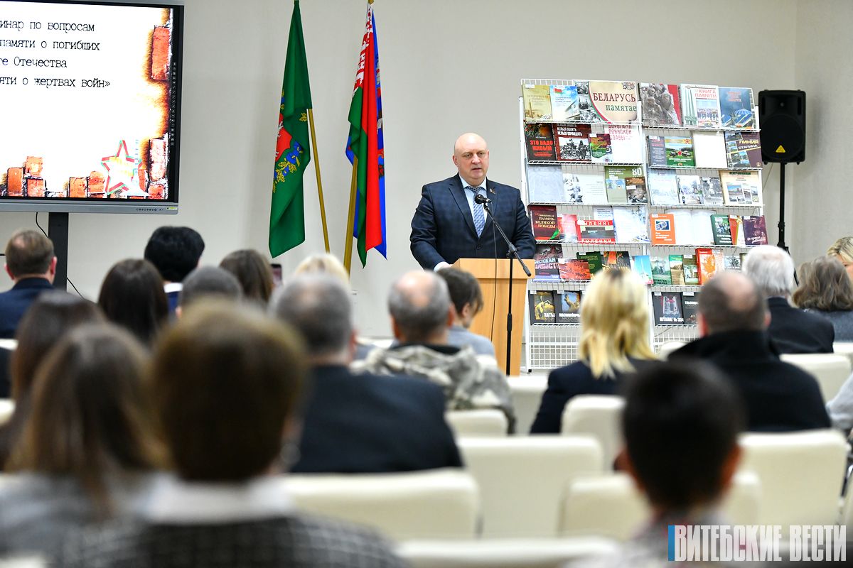 – Опыт сохранения памяти предыдущими поколениями мы должны брать на вооружение и выстраивать эту работу с учетом новых форматов и задач, - подчеркнул, открывая областной семинар по увековечению памяти погибших при защите Отечества и сохранению памяти о жертвах войн председатель Витебского областного Совета депутатов Дмитрий Демидов. – Убежден, основная нагрузка здесь лежит на органах местной власти, которые выступают координаторами в решении вопросов увековечения. Наш святой долг – передать эту эстафету памяти последующим поколениям.