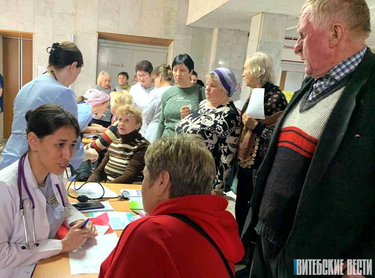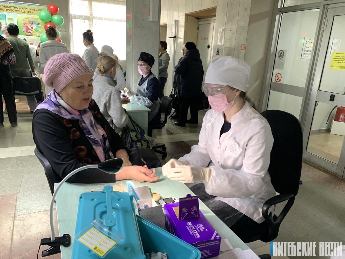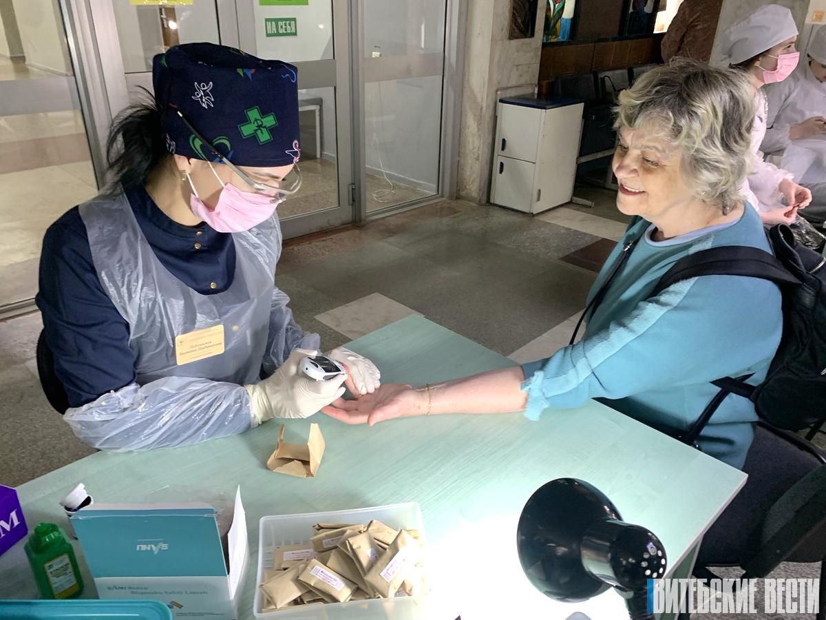 Уже за первый час в кардиоцентре приняли 90 пациентов, которые приехали из разных уголков Витебщины. В рамках акции специалисты измеряли посетителям артериальное давление, делали расчет индекса массы тела, пульсоксиметрию, проводили экспресс-анализы на уровень глюкозы, электрокардиографические исследования, консультации врача-эндокринолога, врача-кардиолога. Спектр медицинских услуг, оказываемых в рамках акции, год от года расширяется.